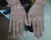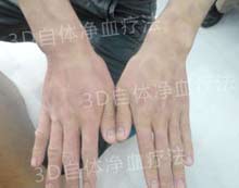 治疗前,手指皮损严重,成斑块状,指甲甲板增厚,有强烈疼痛感