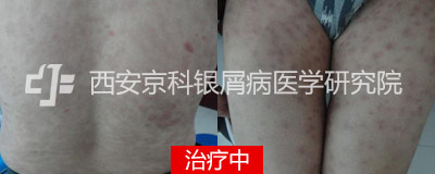查体:患者全身泛发点片状皮损,有银白色的鳞屑及薄膜现象和点状出血。头皮,耳内,耳后,颈部,腹部,背部及双下肢伴有较多点片状皮损鳞屑。并有较多新出点状皮损。