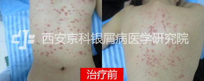 ±íÏÖÖ¢×´£ºÆð³õ¸ì²²ÓÐЩðþÑ÷²¢°éÓÐСºìµã£¬ºó²¡Çé¼ÓÖØÀ©´ó£¬ÍȲ¿ÄËÖÁÈ«Éí³¤³öÇðÕî°ß¿é£¬ÉÏÃæ°éÓкñÖØµÄÒø°×É«ÁÛмÇÒÐÎ×´²»¹æÔò£¬ÇáÇá¹ÎµôƤм¿É¿´µ½±¡±¡µÄÒ»²ãºìĤ£¬¹Î³ýºìĤ¼´¿É·¢ÏÖССµÄ³öѪµã¡£