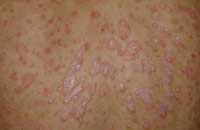 寻常型牛皮癣初期有一种特殊的形态——点滴状牛皮癣,主要表现为粟粒至绿豆大小丘疹,呈点滴状散布全身。临床发现点滴状牛皮癣多发于首次牛皮癣患者身上,且诱发因素多为上呼吸道感染诱发的疾病发作,在青少年及儿童身上表现尤为明显。