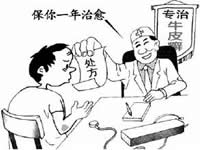 不少银屑病患者经过几年、甚至几十年的治疗,反而“治”成了体无完肤的大面积皮损。究其原因,是社会上不少游医、庸医利用患者盼望尽早根治的心理,用钱收买或高价租用医院门诊的科室,大做“包治”、“根治”、“永不复发”的广告,利用皮质激素和一些免疫抑制剂对银屑病有暂时疗效的特点,配入与银屑病无关的中药,伪装成所谓祖传秘方蒙骗患者,使其遭受毒害之苦。