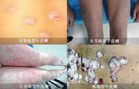 脓疱型牛皮癣分泛发性及局限性。图片中可看到先有密集的针尖大小潜在的小脓疱,很快融合成脓湖,常伴有高热、关节肿痛及全身不适,血常规化验可见白细胞增多,脓疮干涸后,随即脱屑,皮屑脱落后,又有新的脓疮出现。